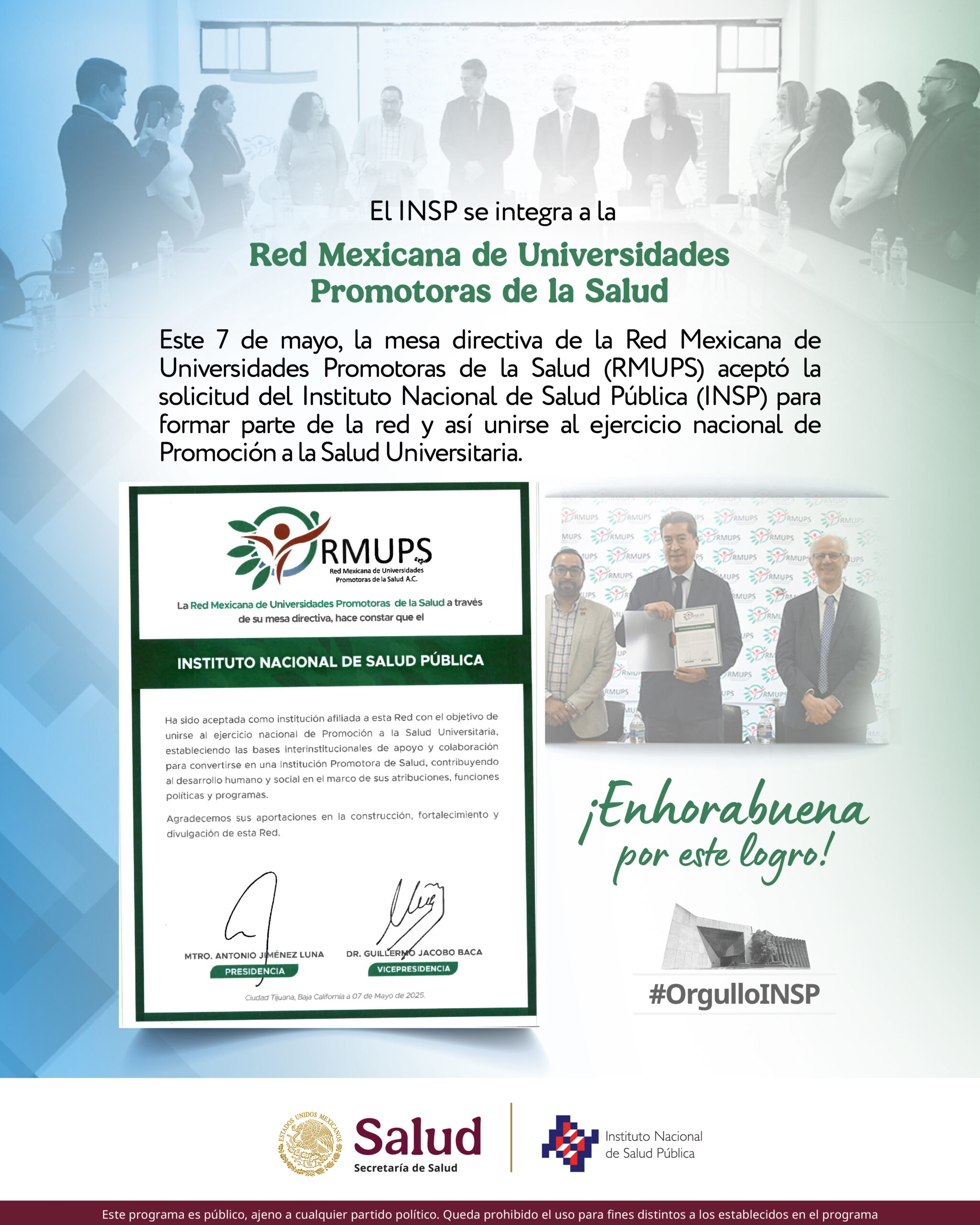Esta incorporación representa una valiosa oportunidad para fortalecer las acciones del INSP en materia de promoción de la salud, a través de colaboraciones estratégicas con otras universidades del país. Más allá de obligaciones formales, la pertenencia a la RMUPS abre las puertas a actividades conjuntas académicas y comunitarias, enfocadas en mejorar las condiciones de salud y bienestar de las comunidades universitarias y de la población en general.