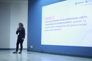 Posteriormente, el Mtro. Daniel Manzur, profesor invitado de la Secretaría de Seguridad y Protección Ciudadana, participó de manera virtual con una exposición sobre resoluciones jurídicas relevantes en el ámbito de los derechos humanos de las personas LGBTI+, abordando fallos emblemáticos de la Corte Interamericana de Derechos Humanos, la Suprema Corte de Justicia de la Nación y la Comisión Nacional de los Derechos Humanos.
