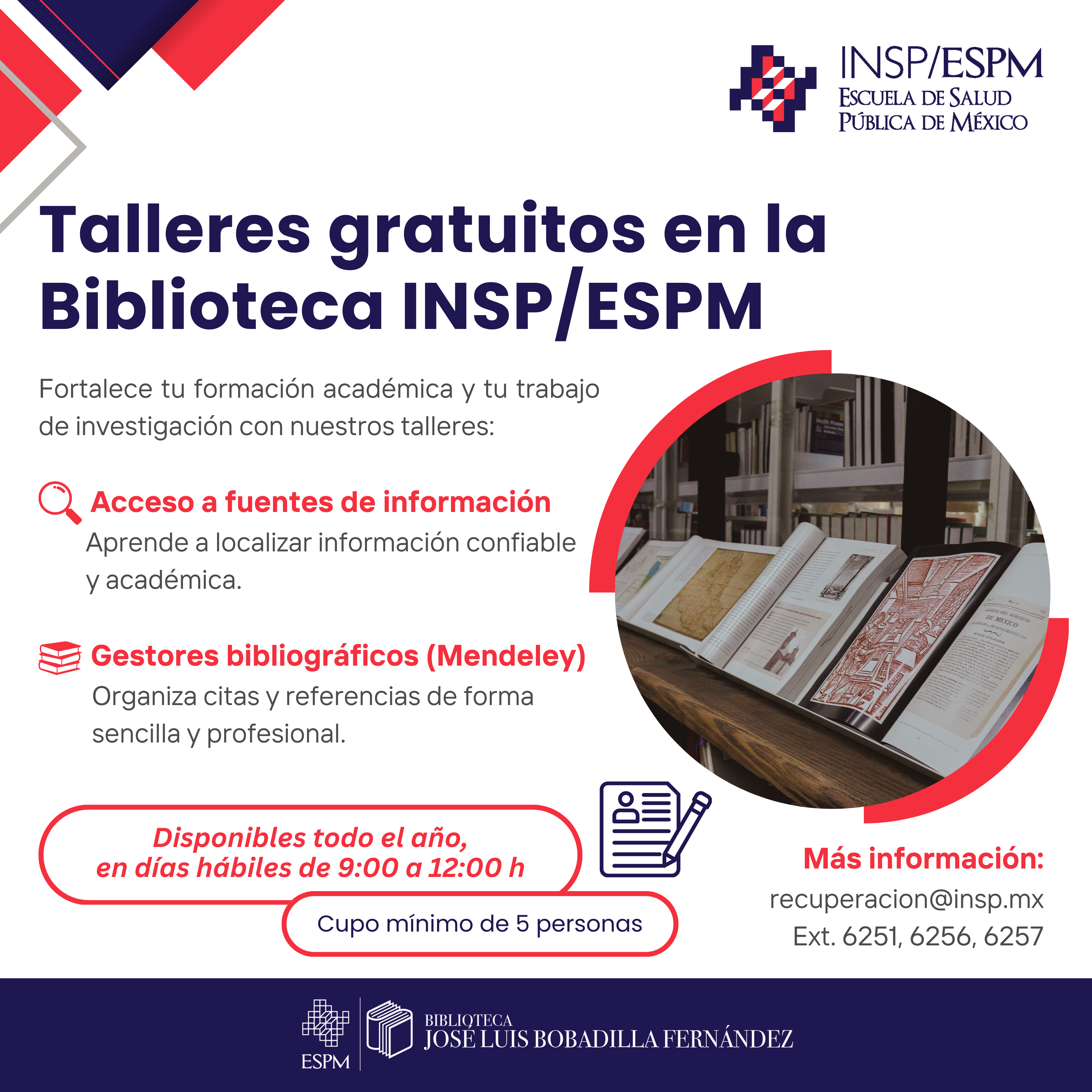 Ofrece contenidos especializados en salud pública y áreas afines. Su amplio acervo bibliográfico –compuesto por 16,000 mil volúmenes de libros, folletos, tesis y videos, entre otros documentos, así como 700 títulos de publicaciones científicas, un núcleo de revistas electrónicas y bases de datos con acceso a documentos de texto completo– la convierte en una fuente de información relevante para la comunidad académica del Instituto Nacional de Salud Pública (INSP), brindando apoyo al desarrollo de proyectos, líneas de investigación y a la formación profesional que desempeña la Escuela de Salud Pública de México (ESPM).